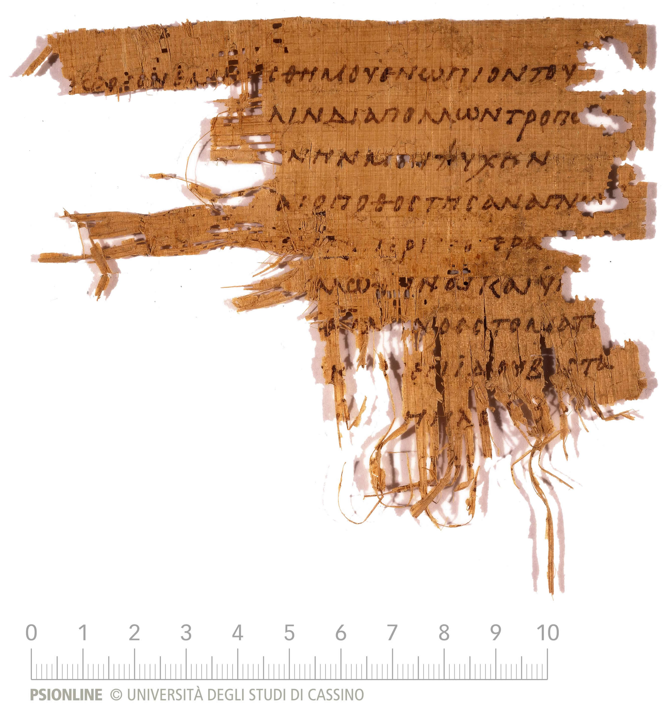 Il papiro proviene dagli scavi a Behnesa; tuttavia impossibile risalire all’anno del ritrovamento: nell’introduzione al II vol. (p. III, nt. 1) Vitelli premette che “… hanno scavato a Behnesa (Oxyrhynchos) il prof. Pistelli nell’inverno del 1910, 1912 e 1913, il dott. Farina nell’inverno del 1911”. Sul verso, si leggono le lettere ,,,. Datazione originaria: IV-V d.C. Bibliografia: Pack2 2899; F. Ronconi, “Papiri Letterari della Biblioteca Medicea Laurenziana”, CD-Rom, Cassino 2002, scheda nr. 120 (in cui è stata proposta la datazione al V d.C., qui riportata). |